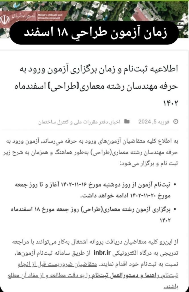 🔴اطلاعیه ثبت‌نام و زمان برگزاری آزمون ورود به حرفه مهندسان رشته معماری(طراحی) اسفندماه ۱۴۰۲